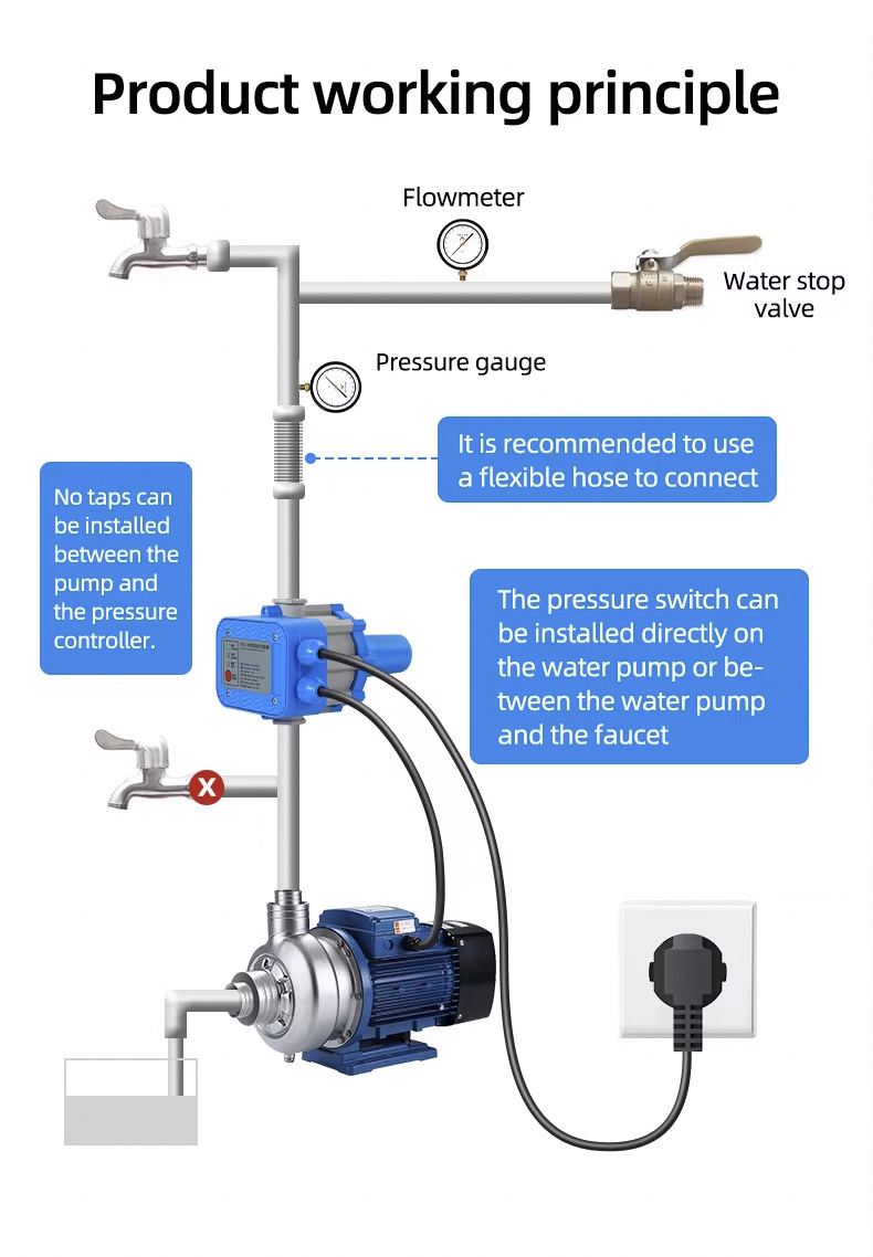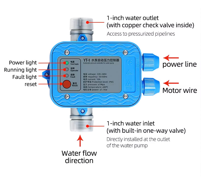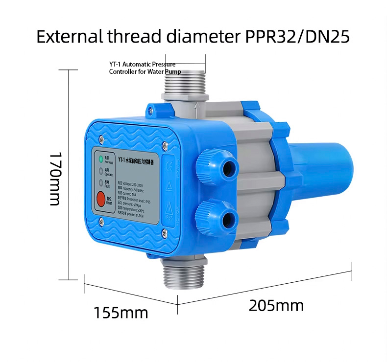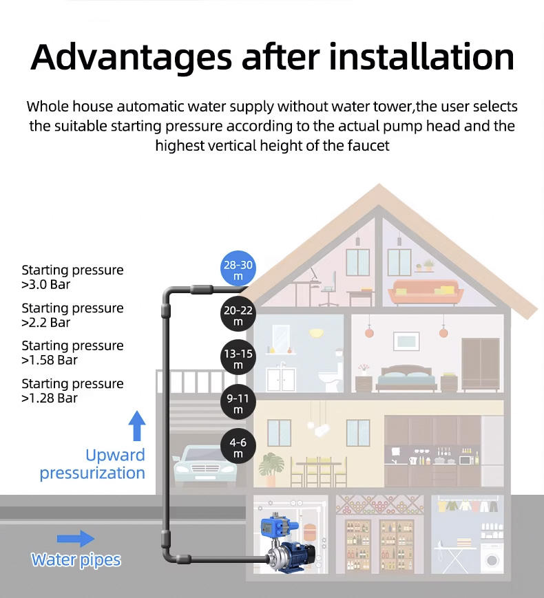 Automatisk pumpregulator Vattenpumpens elektroniska tryckregulator kan ersätta de komplicerade installationerna av automatisk vattenpump. Den har egenskaperna stabil prestanda, lågt underhåll och lång livslängd.