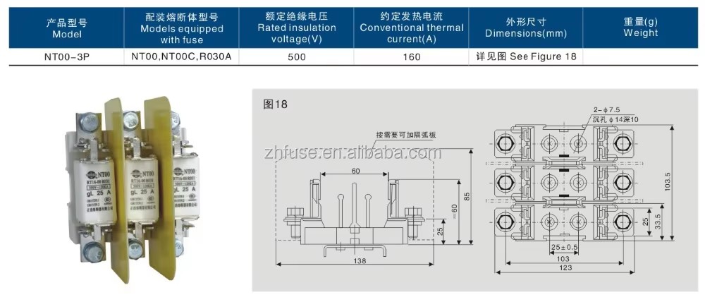 Zhenghao är både leverantör, tillverkare och handlare som tillhandahåller fullständiga anpassnings- och designanpassningstjänster både inhemskt och internationellt. NT00-3P-säkringsbasen är utrustad med säkringstyper såsom NT00, NT00C, R030A, etc., med en klassad isoleringsspänning på upp till 500V och en viss värmeström på 160A.