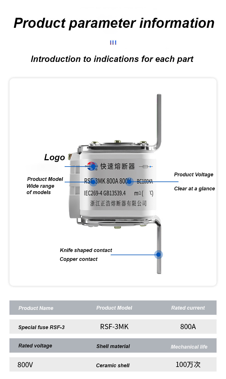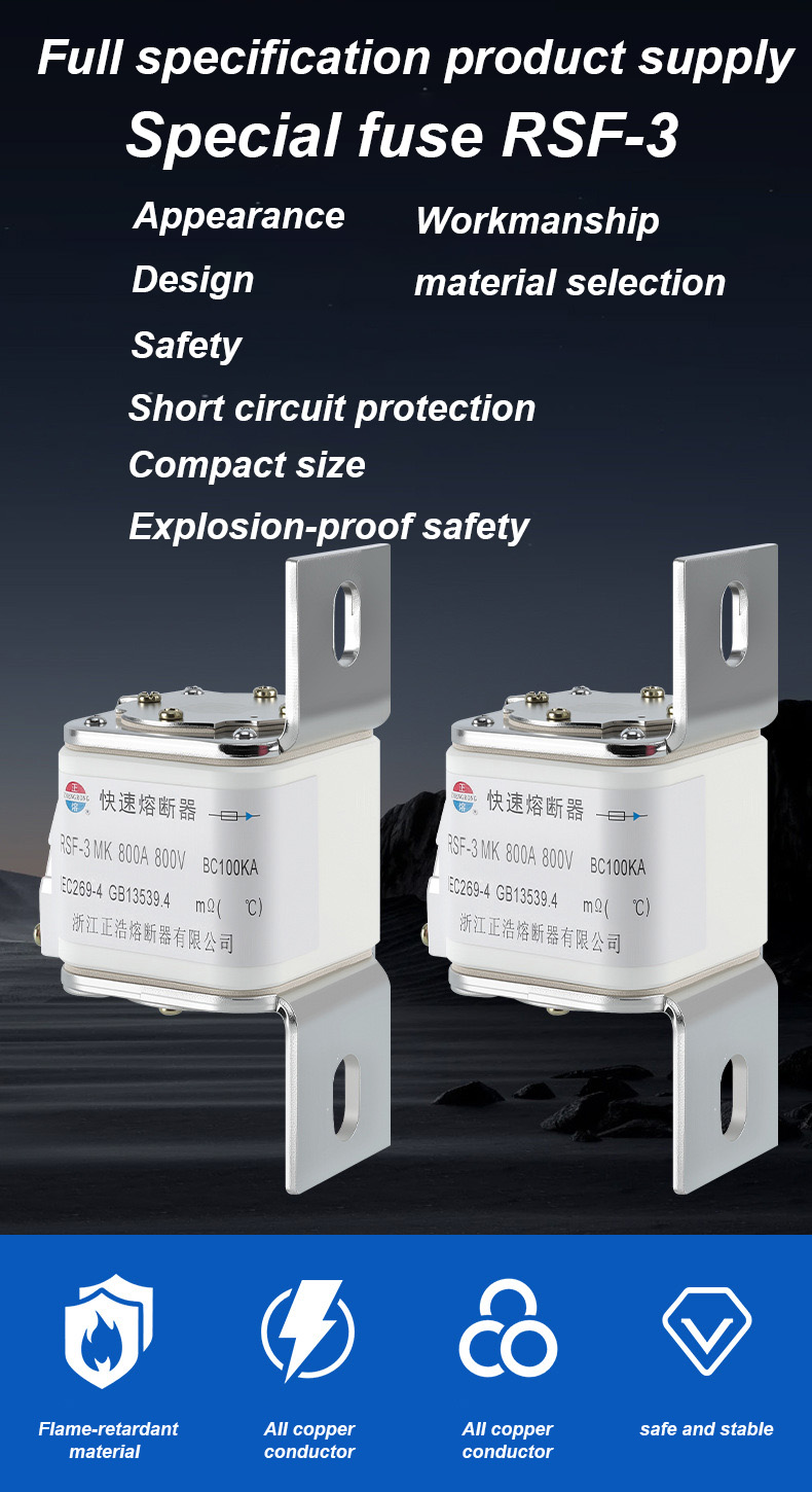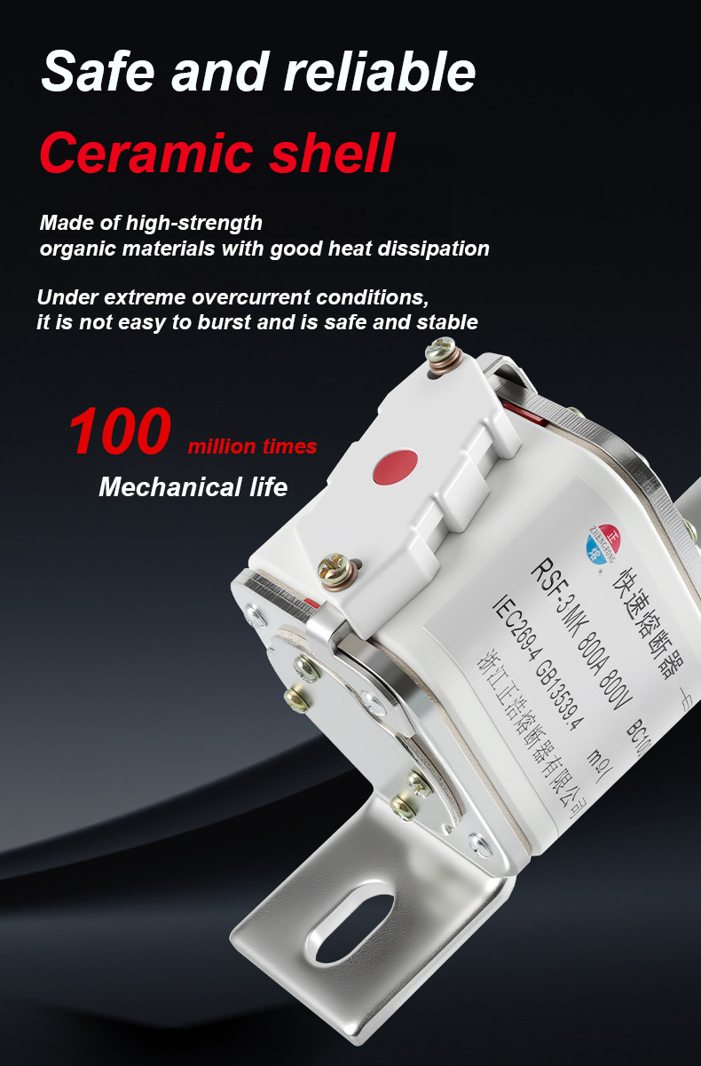 har en märkspänning på 500V och en märkström på 315A, vilket effektivt kan säkerställa elsäkerhet, förhindra överbelastning och kortslutning. RSF-3MK 800V-800A BC100KA säkringslänkar