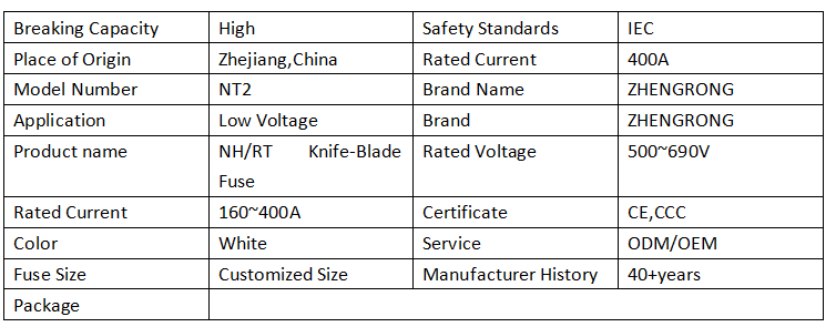 ZHENGRONG NT2 315A 500V Fuse square keramiska säkringar används ofta i industriell elektrisk utrustning, kraftsystem och elektronisk utrustning för att skydda kretsar från överbelastning och kortslutning.